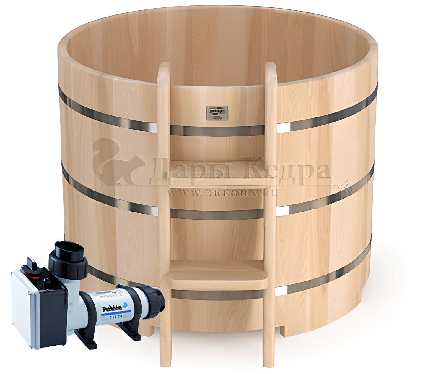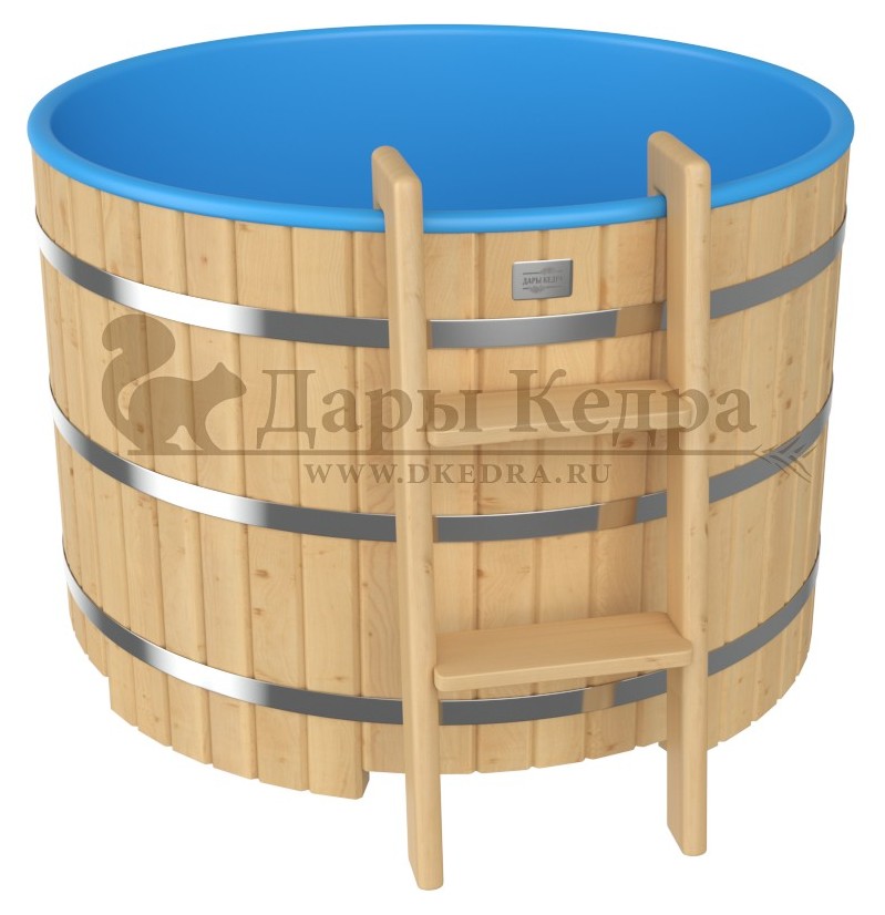 • Бондарная круглая купель из кедра с пластиковой вставкой Особенность этой модели заключается в сборке купели по технологии лунный-паз. Паз (углубление) одной доски прочно соединяется с выемкой следующей. Такая сборка осуществляется без клея и гвоздей. Готовая конструкция прочно фиксируется нержавеющими обручами. Пластиковая вставка придает изделию красивый внешний вид, увеличивает срок службы и облегчает уход за купелью. Для удобства пользования купель оснащена лавочками, приставной и внутренней лестницей из кедра. Подходит для комнатного и уличного использования. Купели с пластиковой вставкой рекомендуется заказывать для непрерывного использования в банных комплексах или оздоровительных центрах. Внутренняя чаша облегчает уход за изделием и увеличивает срок службы купели.